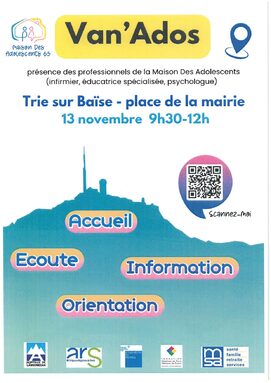 Il sera présent à la place de la mairie à Trie-sur-Baïse une fois par mois. Les adolescent.e.s, les parents et les professionnel.le.s peuvent prendre rendez-vous grâce au QR code sur le flyer et l'affiche ci-joints. Les adolescent.e.s pourront se rendre au Van si nécessaire sur le temps scolaire avec une autorisation des responsables légaux. Ils pourront être accompagné.e.s si besoin par un personnel de l'établissement.