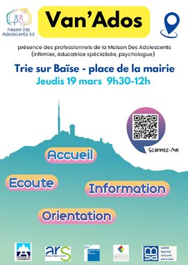 Il sera présent à la place de la mairie à Trie-sur-Baïse une fois par mois. Les adolescent.e.s, les parents et les professionnel.le.s peuvent prendre rendez-vous grâce au QR code sur le flyer et l'affiche ci-joints. Les adolescent.e.s pourront se rendre au Van si nécessaire sur le temps scolaire avec une autorisation des responsables légaux. Ils pourront être accompagné.e.s si besoin par un personnel de l'établissement.
