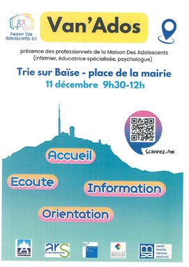 Il sera présent à la place de la mairie à Trie-sur-Baïse une fois par mois. Les adolescent.e.s, les parents et les professionnel.le.s peuvent prendre rendez-vous grâce au QR code sur le flyer et l'affiche ci-joints. Les adolescent.e.s pourront se rendre au Van si nécessaire sur le temps scolaire avec une autorisation des responsables légaux. Ils pourront être accompagné.e.s si besoin par un personnel de l'établissement.